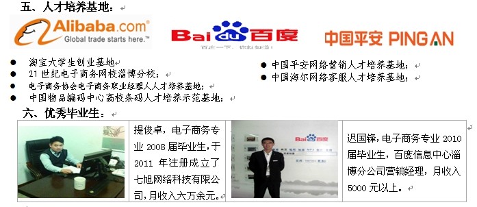 七、淄博职业学院招生代码:13009 l 电子商务专业代码:620405 l 招生科类:文科、理科 八、联系方式: l 咨询电话:2348126、2348125、曹老师 18653376869 尹老师 13583315446 l QQ:2205516326(电子商务专业咨询) 腾讯微博:淄博职业学院电子商务专业 l 邮箱:zbvcdzsw@163.com |