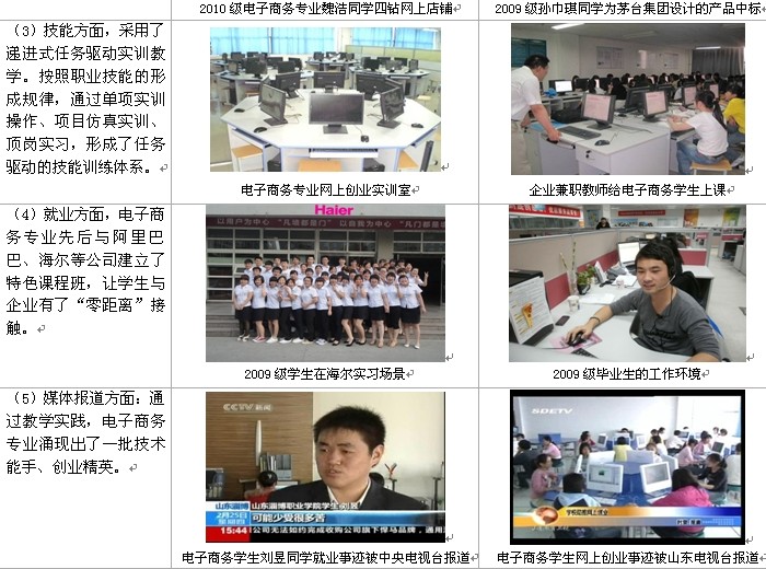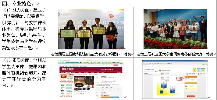 电子商务专业简介 比尔·盖茨曾经说过:要么电子商务,要么无商可务。通俗地说,电子商务就是利用网络开展的所有商业贸易活动。随着全球电子商务高速增长,电子商务人才缺口相当惊人,预计我国在未来10年大约需要200万名电子商务专业人才。电子商务的时代已经到来,要想成为未来商业领域的弄潮儿,电子商务专业是您明智的选择。 一、人才培养目标: 培养适应社会生产、建设、管理、服务一线需要的,具备经济管理理论与现代信息技术专业知识,具备从事电子商务策划、网络营销、物流管理、信息管理、系统开发及国际、国内商务贸易的基本技能和职业素质,胜任网络营销、国际(内)贸易、电子商务平台与网站设计等主要职业岗位的高素质应用型专门人才。 二、电子商务专业方向: l 网络营销方向 l 网上创业方向 l 内、外贸电子商务专员方向 l 网络客服方向 l 网站美工方向 三、专业优势: l 网站设计方向 本专业是山东省较早开办的高职电子商务专业,也是学院重点建设专业之一。电子商务专业在全国商科院校专业综合竞争力排名第13位,山东省同类院校电子商务专业中居领先地位,就业率连续三年在98%以上,毕业生满意率、学生家长满意率连续三年在96%以上。多名同学获国家励志奖学金,省、市级优秀学生称号。